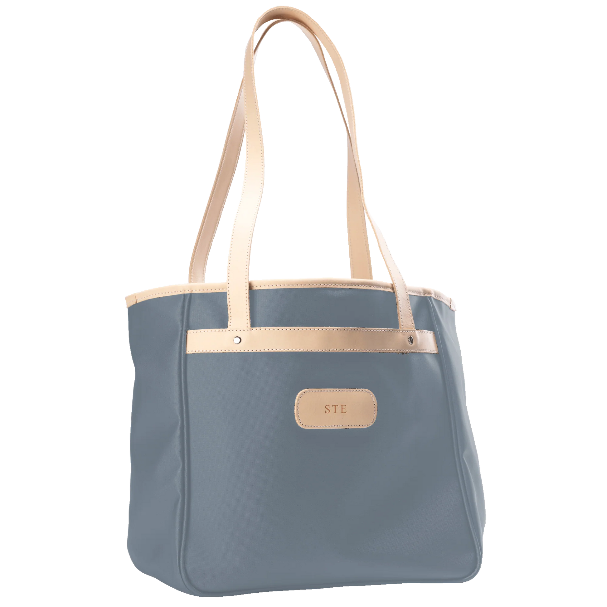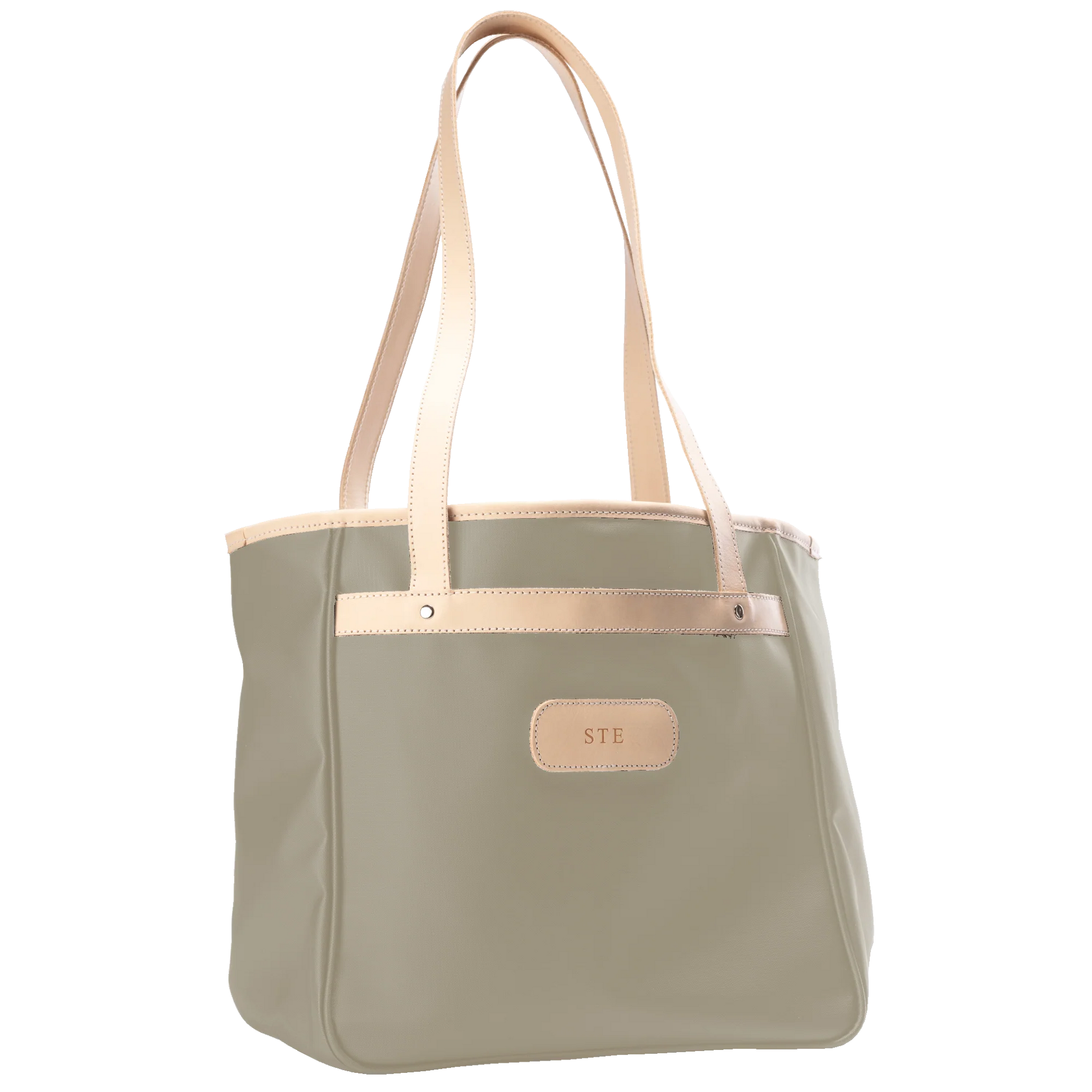Vinyl coated canvas with natural leather trim. Includes a Trolley Sleeve Approximate Dimensions (inches): 13.5h x 13w x 6.5d