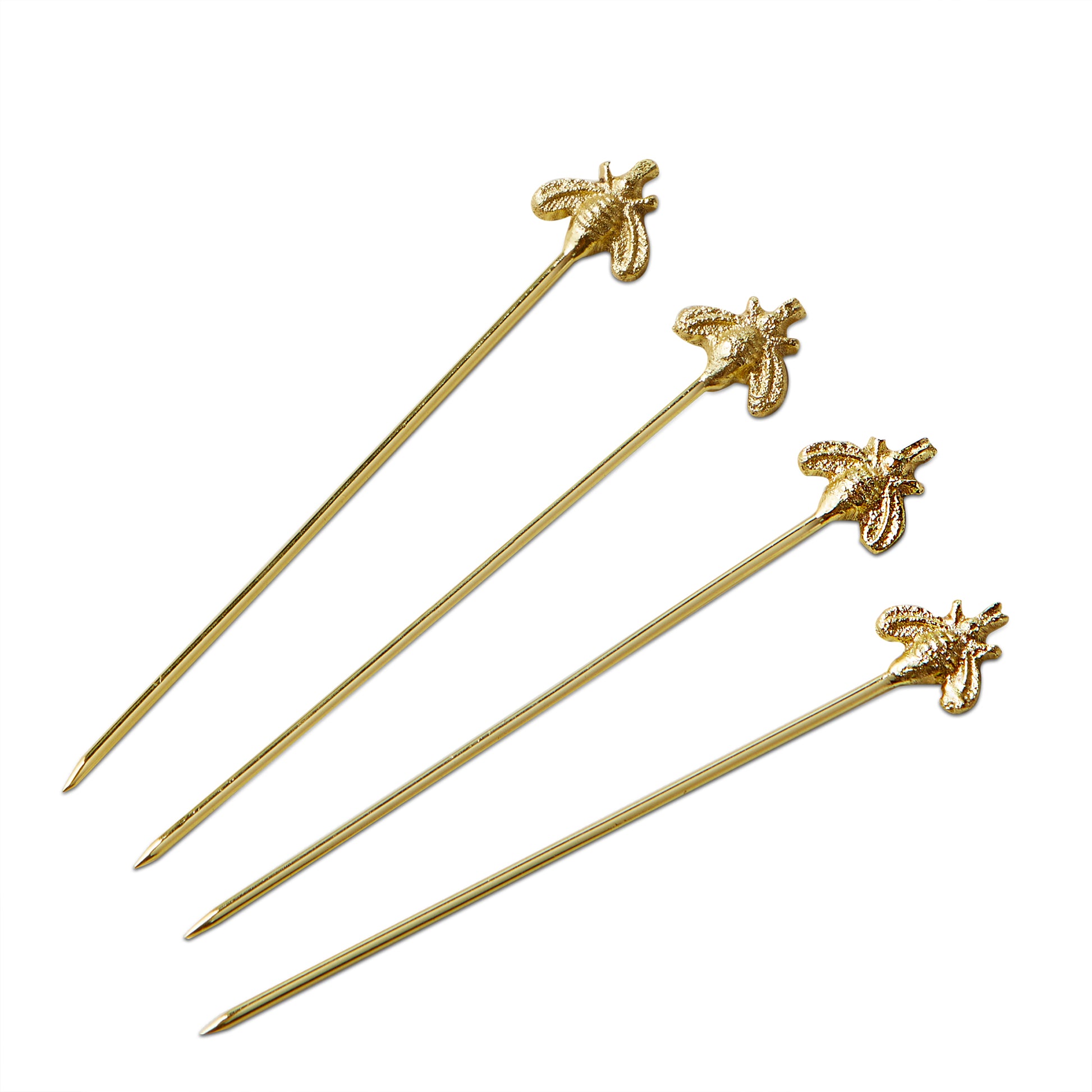 This set of 4 gold-toned bee cocktail picks adds a whimsical touch to drinks, appetizers, or charcuterie boards. Crafted from aluminum and stainless steel.
