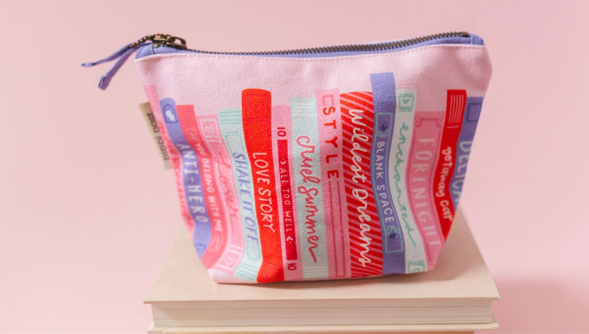 Keep your essentials in a stylish Eras Book Tour Canvas Pouch, inspired by Taylor Swift’s most iconic songs. Featuring a hand-illustrated bookshelf stacked with track titles from every era, this zippered pouch is perfect for storing books, stationery, or everyday must-haves. A must-have accessory for Swifties and book lovers alike!