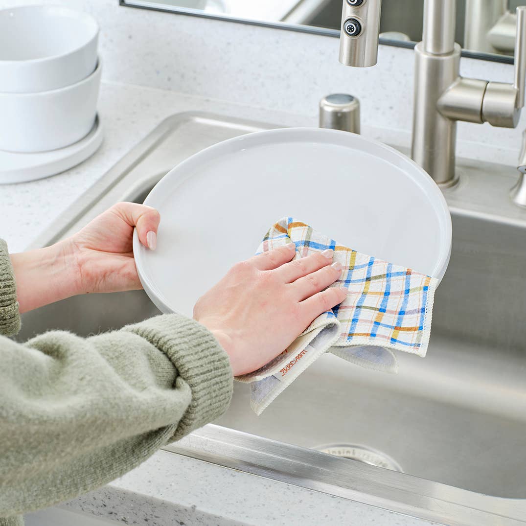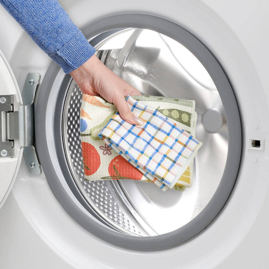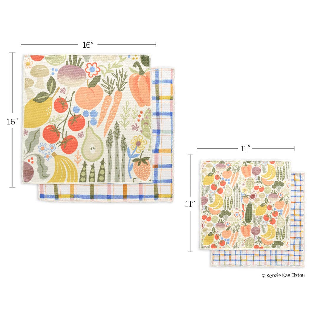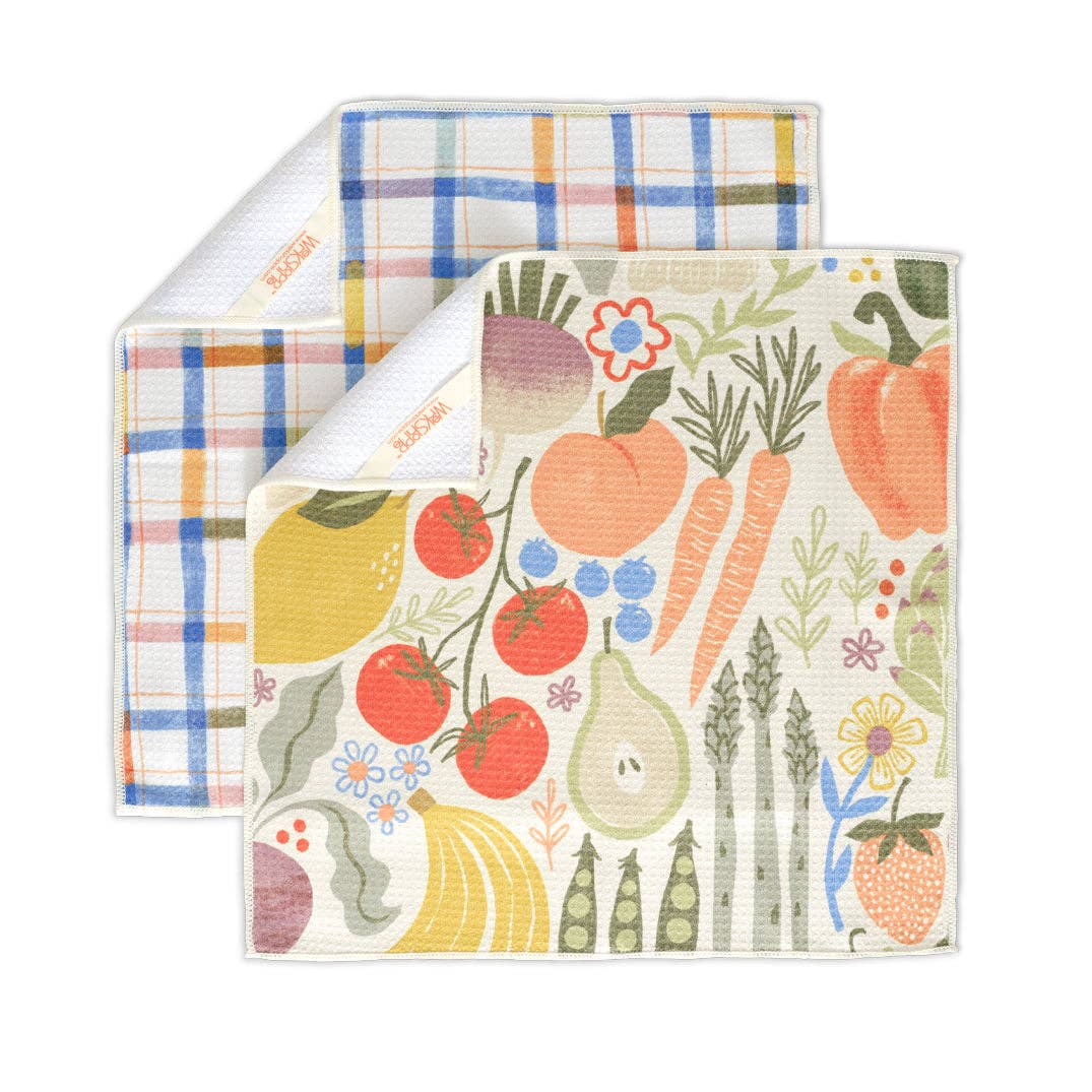 A set of 4 hard-working microfiber towels, 2 different sizes and designs feature a variety of tossed fruits and vegetables and a fresh multicolor windowpane plaid.