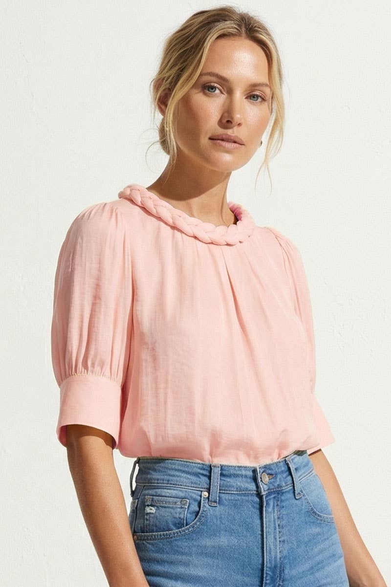 Women's Half Sleeve Braided Detail Blouse Lightweight woven fabric with a soft, airy feel. Braided neckline adds a unique, elevated touch. Half sleeves create an easy, relaxed silhouette. Style with tailored pants for a polished look or pair with denim for effortless everyday chic. Fabric: Woven 100% Polyester Hand Wash Cold