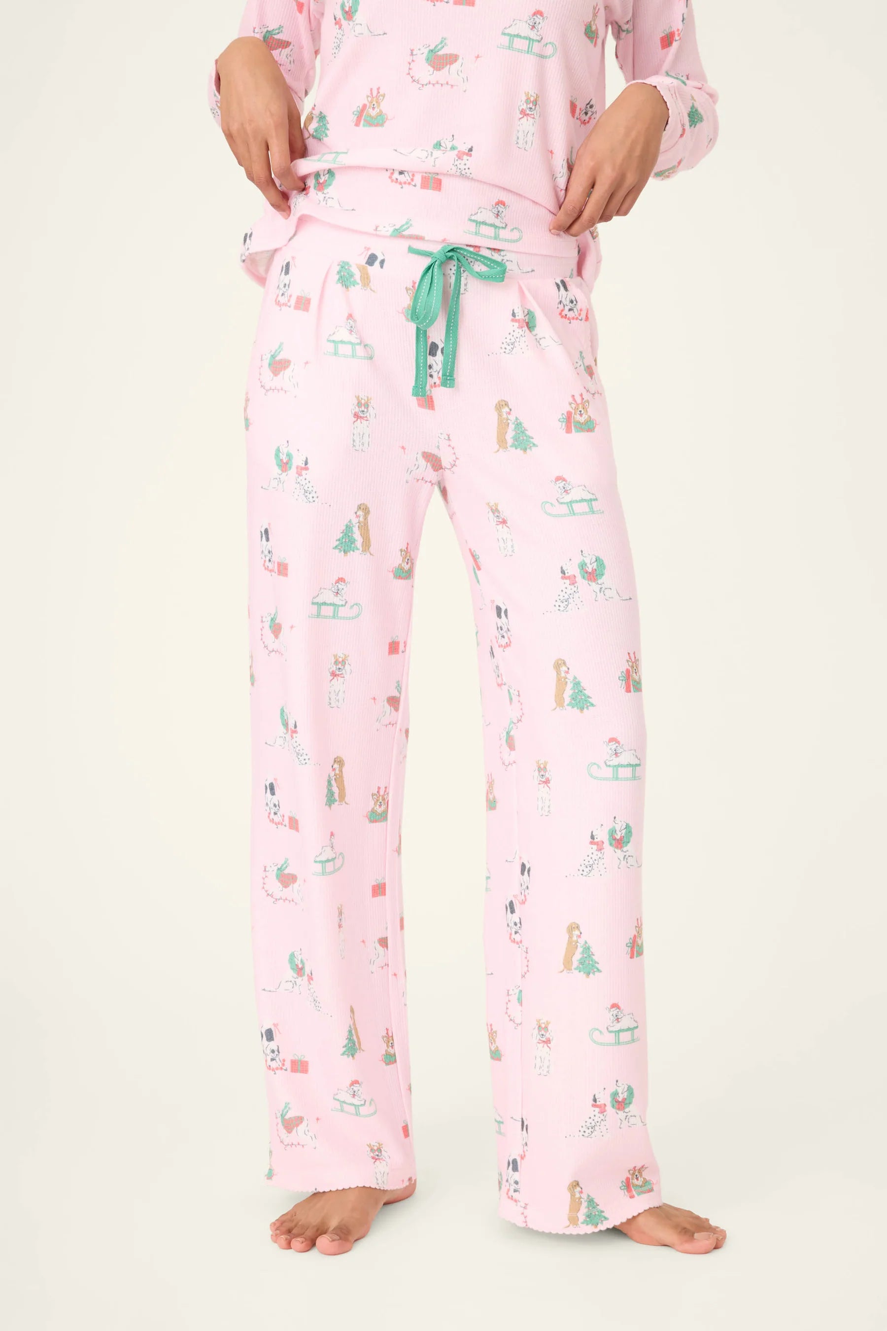 Deck the dogs with boughs of holly—these PJ's are a holiday spirit wrapped in baby peachy waffle. Printed with pups in wreaths, lights, and festive gear, the long-sleeve crew top and drawstring pants bring cozy comfort with a playful twist that’s made for tree-trimming nights and Christmas-morning lounging.